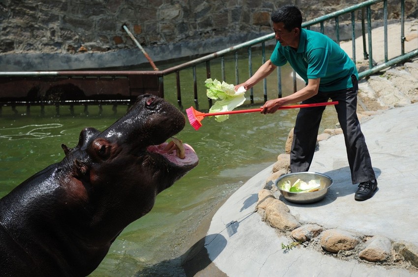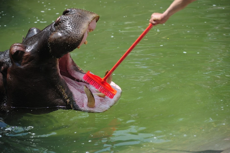 Čak i nilski konji moraju povremeno da operu zube. Ali za taj posao je zadužen samo najhrabriji radnik Zoološkog vrta, koji se ne plaši da bukvalno stavi ruku u čeljust ove simpatične, ali opasne divlje životinje.