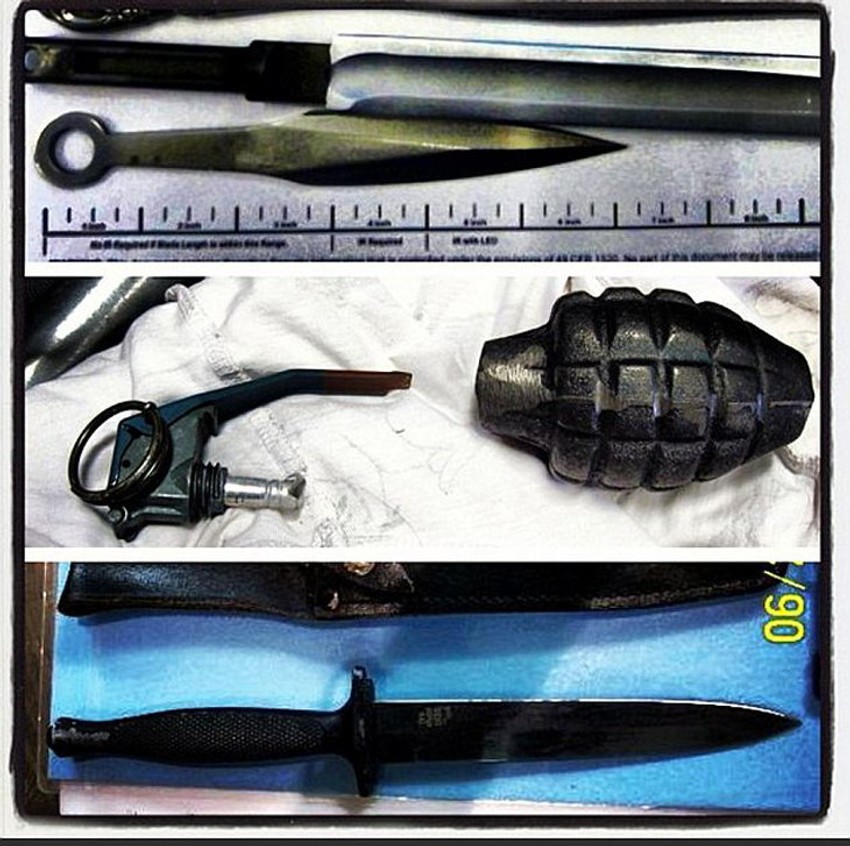 Jedan 45-milimetarski pištolj i šaržer pronađeni su u portabl kasetofonu. Drugi put, isti tip pištolja napunjen sa sedam metaka, pronašen je skriven ispod postave ručne torbe.