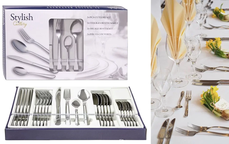 Najbolji escajg je od nerđajućeg čelika i set od 24 komada može biti vaš za 1.799 dinara samo jednim klikom na gruppi.rs. U kompletu vas očekuje - 6 kašika, 6 viljušaka, 6 noževa i 6 kašičica!