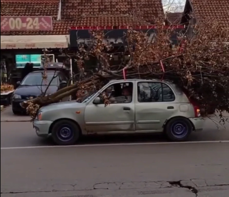 Kako se može videti na viralnom snimku objavljenom na Instagram stranici "Moj_Beo_grad", domaćin je auto natovario i skoro ga pa prekrio s ogromnom granom hrasta.