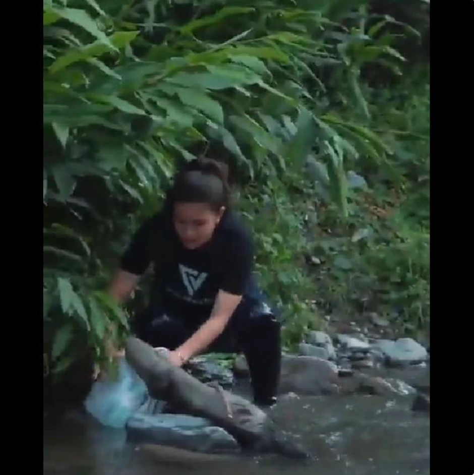 Akterka snimka i autor našli su se nadomak reke pune brzaka, kada su sa druge strane primetili belu vreću vezanu pri vrhu. Devojka je potom nekako uspela da, kroz vodu, dođe do nje i odveže je, kada su se ukazale tri malene glavice.