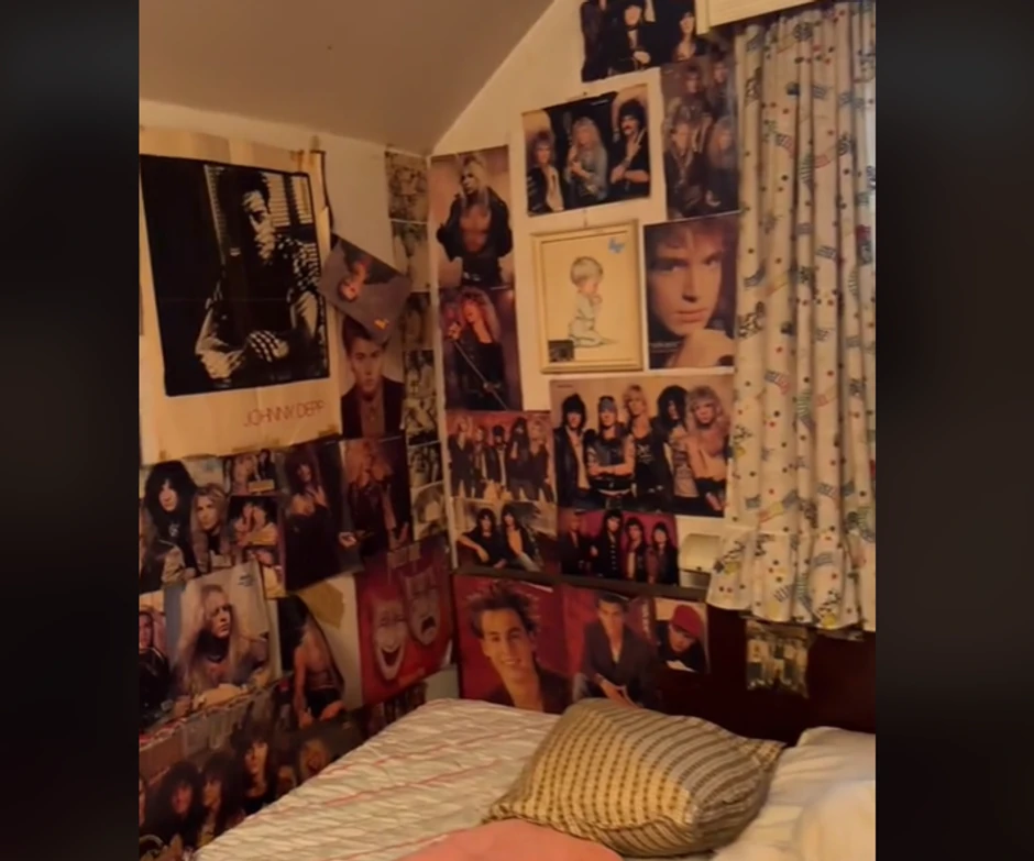 Unutrašnjost sobe bila je živopisna slika tinejdžerskog života pre četiri decenije. Posteri rok bendova poput Def Leppard, Whitesnake i Motley Crüe prekrivali su zidove, dok su mladi Džoni Dep i The Edge iz grupe U2 dodali atmosferu iz 80-ih.
