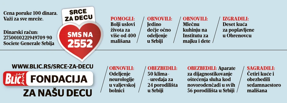 Svi ljudi dobre volje koji žele da pomognu mogu da pošalju SMS na humanitarni broj 2552 ili da uplate sredstva na dinarski tekući račun “Blic fondacije”: 2750010221949709 90 ili na devizne račune 10221949724 45 - za uplate u evrima; 10221949711 84 - za uplate u švajcarskim francima i 10221949717 66 - za uplate u dolarima, Societe Generale Srbija, Beograd.