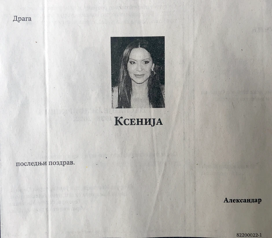 - Draga Ksenija, poslednji pozdrav - piše u čitulji.