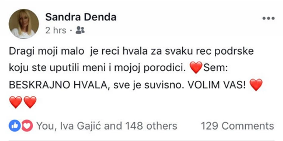 "Dragi moji, malo je reći hvala za svaku reč podrške koju ste uputili meni i mojoj porodici, sem beskrajno hvala, sve je suvišno. Volim vas", napisala je povređena novinarka posle borbe za život koja je trajala nepuna dva meseca.