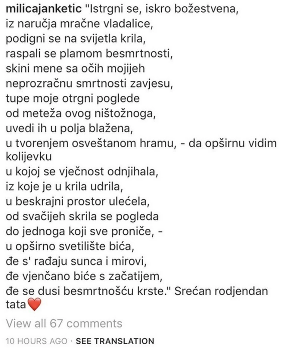 - Istrgni se, iskro božanstvena, iz naručja mračne vladalice, raspali se plamom besmrtnosti... - stoji, između ostalog, ispod fotografije pokojnog Miše na profilu njegove ćerke, a celu objavu pronaći ćete ispod.