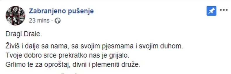 - Dragi Drale. Živiš i dalje sa nama, sa svojim pjesmama i svojim duhom. Tvoje dobro srce prekratko nas je grijalo. Grlimo te za oproštaj, divni i plemeniti druže - stoji u statusu.
