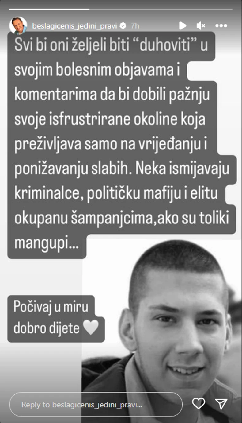 – Svi bi želeli biti “duhoviti” u svojim bolesnim objavama i komentarima da bi dobili pažnju svoje isfrustrirane okoline koja preživljava samo na lečenju i ponižavanju slabih. Neka ismejavaju kriminalce, političku mafiju i elitu okupanu šampanjcem, ako su toliki mangupi…. Počivaj u miru dobro dete – napisao je Bešlagić.