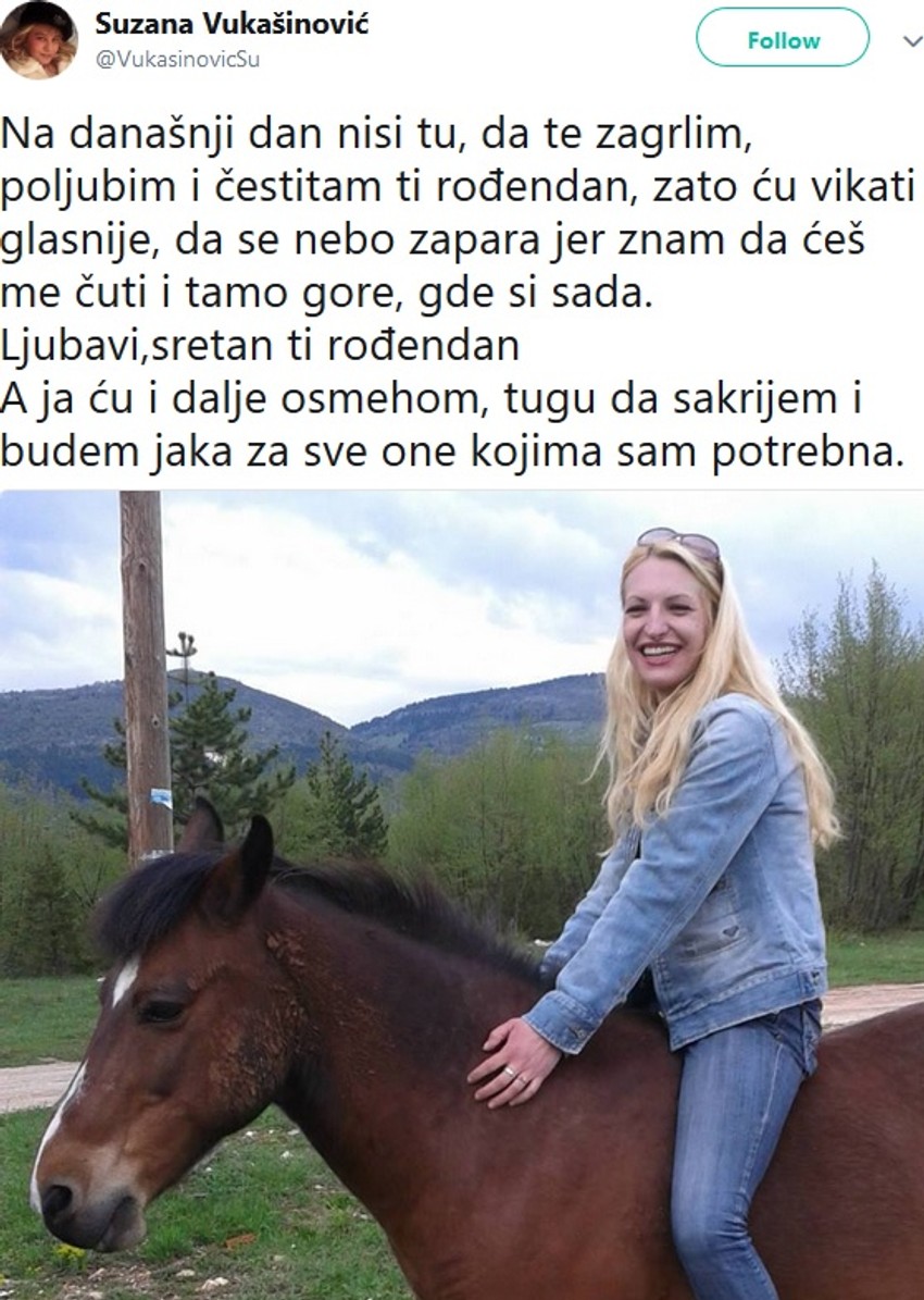Milićeva supruga Suzana Vukašinović danas je objavila potresnu poruku, na svom profilu na tviteru kojom je pokojnoj Maji čestitala rođendan.