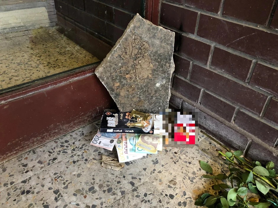 Ispred se nalazi novac, ratluk, kao i cigarete, dok pored stoji položeno i cveće.