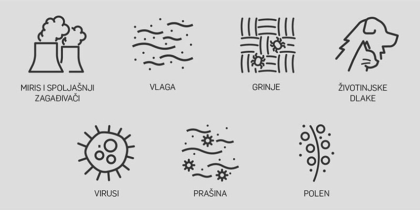 - Prašina i grinje – Prašina je jedan od najrasprostranjenijih zagađivača vazduha u zatvorenim prostorijama, a uz nju tu su i grinje. Svaka grinja dnevno stvara 20 zrna izmeta koja završe u vazduhu i u našim plućima. Grinje predstavljaju veliki problem za one koji su alergični na ove parazite, ali mogu biti i izvor neprijatnosti čak i za one koji nisu alergični.