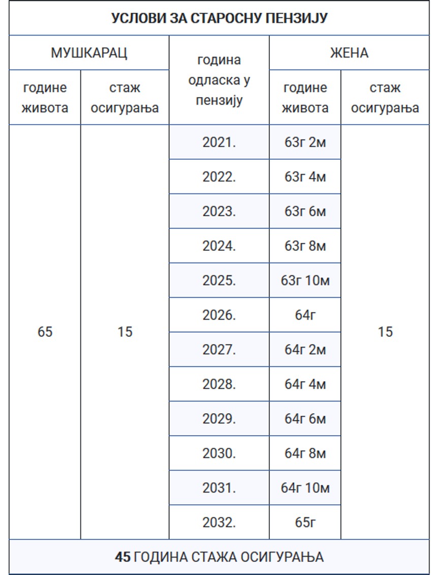 S druge strane, muškarci u starosnu penziju u narednoj godini idu po starom - sa 65 godina života i 15 godina staža upisanog u radnu knjižicu.