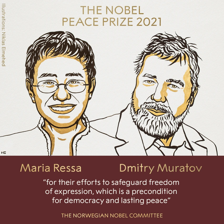 Dobitnici ovogodišnje Nobelove nagrade za mir su novinarka sa Filipina Marija Resa i novinar iz Rusije Dmitrij Muratov za napore da obezbede slobodu izražavanja, koja je preduslov demokratije i trajni mir, saopštila je danas predsednica Norveškog Nobelovog komiteta Berit Rajs-Andersen.