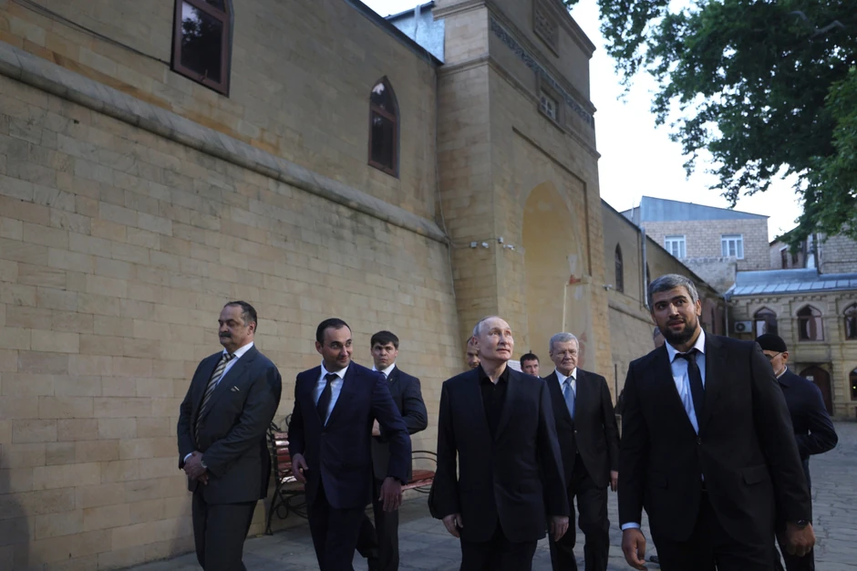 Putin je odleteo u grad Derbent u pretežno muslimanskom regionu da obeleži islamski praznik Kurban-bajram i poseti drevnu citadelu i istorijsku džamiju gde se zaustavio da ljudi da “ljudi fanova, pozira za selfije i rukuje sa oduševljenom gomilom”, navodi list.