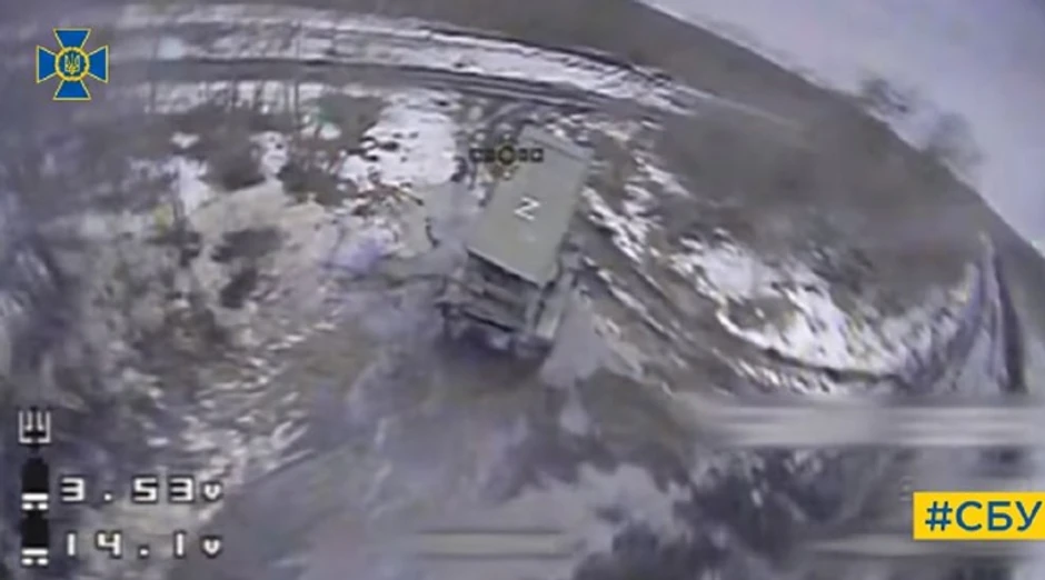 Ka njemu ide dron, koji u jednom trenutku blago skrene, a zatim se zaleti u vozilo na zemlji. To je, po svoj prilici, dron kamikaza. Snimak nije nezavisno verifikovan.