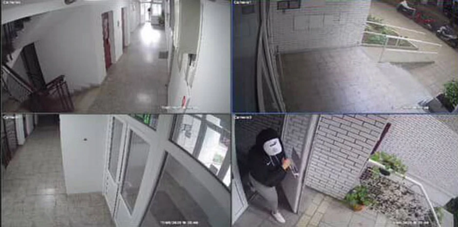 Kako se vidi na snimku sa sigurnosnih kamera, troje ljudi je zvonilo na svaki interfon dok im neko nije otvorio vrata zgrade.