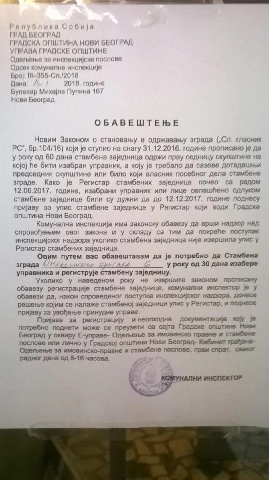 Ako vam je ovo obaveštenje zalepljeno na zgradi, preti vam kazna od DVA MILIONA DINARA