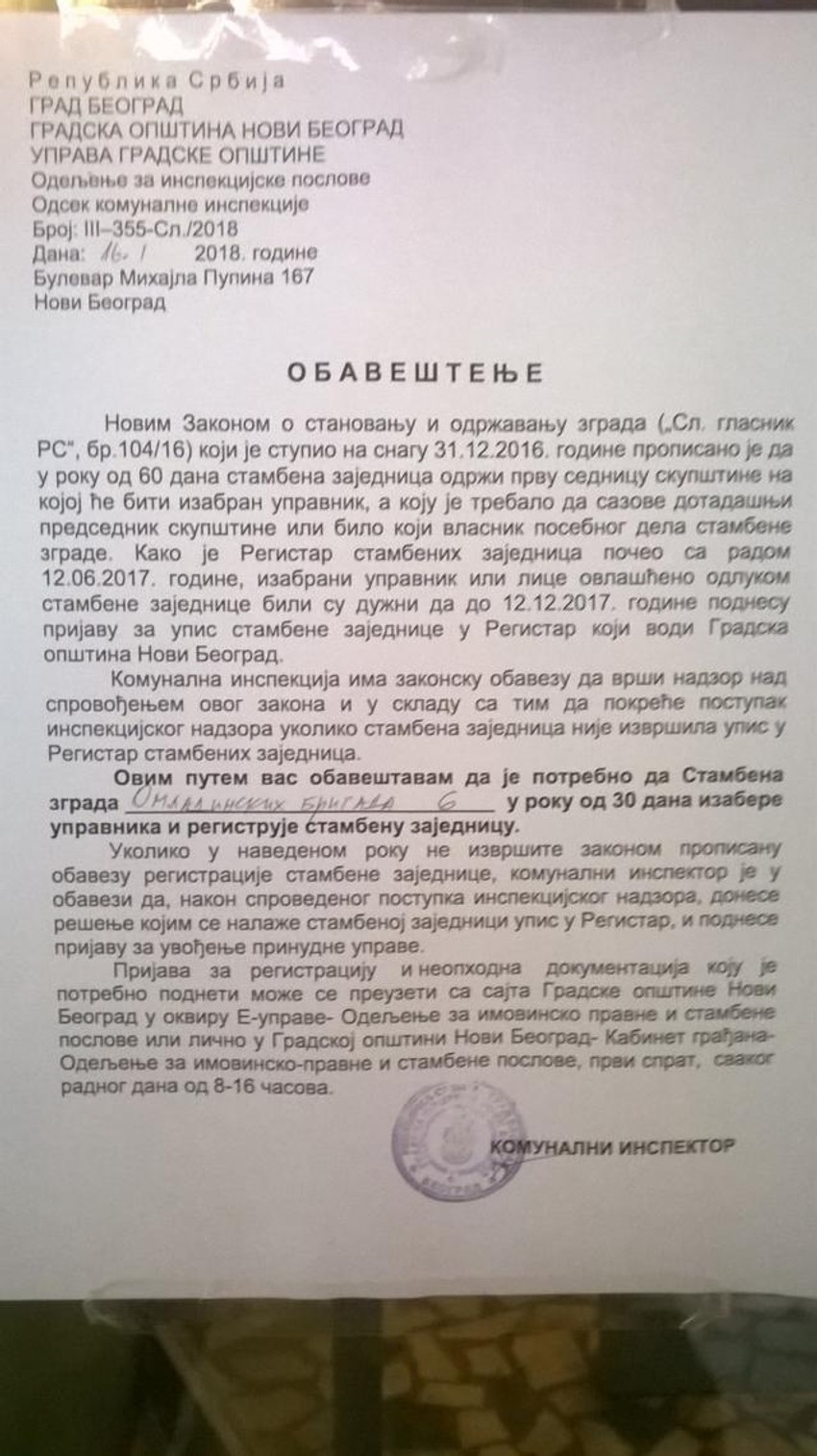 Ono što je važno naglasiti jeste da u slučaju da ne registrujete stambenu zajednicu komunalna inspekcija ima obavezu vođenja postupka u cilju postavljanja prinudnog upravnika.