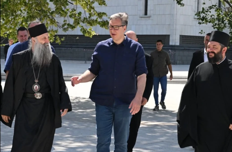 - Počastvovan sam što sam se u Hramu Svetog Save, veličanstvenom svedočanstvu naše vere, istorije i kulture, zajedno sa Njegovom svetošću patrijarhom Porfirijem susreo sa istaknutim ruskim umetnikom Nikolajem Muhinom, autorom impozantnih mozaika koji krase unutrašnjost ove srpske svetinje - objavio je Vučić na Instagram stranici "budućnostsrbijeav".