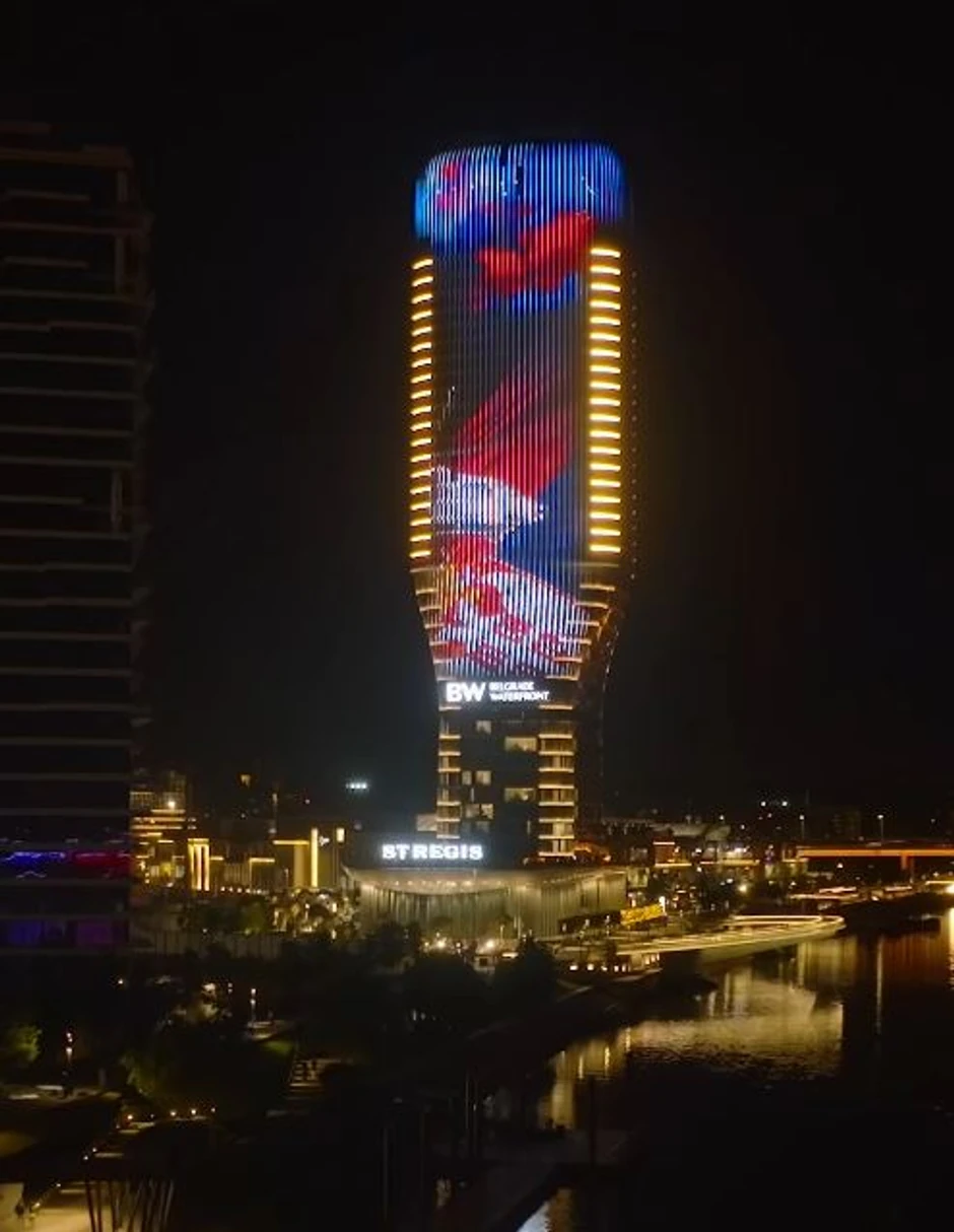 Kula Beograd večeras je osvetljena animacijom koja ističe značaj vojne parade