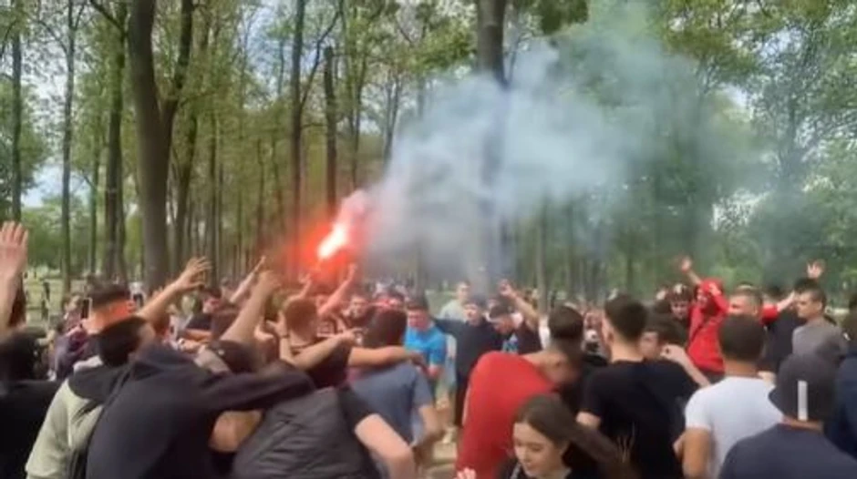 Mladi tradicionalno za Prvi maj pevaju pesmu Đurđevdan, dok je nekolicina njih upalila i baklje, penju se na stolove.