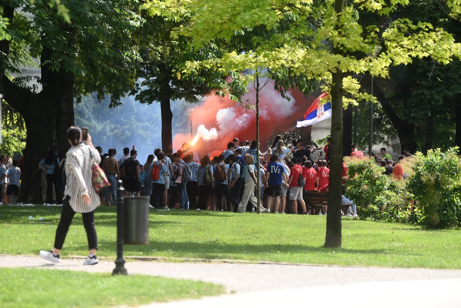 Velika grupa njih okupljena u Pionirskom parku zapalila je baklje, a palo je i kupanje u fontani na Slaviji.