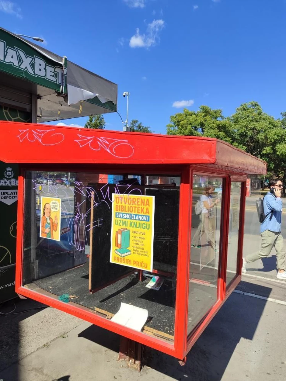 Na kiosku je istaknuto obaveštenje: „Otvorena biblioteka – svi smo članovi. Uzmi knjigu, pročitaj je, donesi svoju ili vrati pročitanu“.