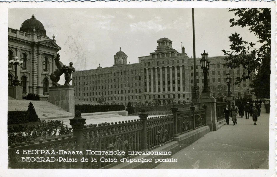 Razglednica na kojoj se vide novoizgrađene Palata Glavne pošte (Poštanske štedionice) i Skupština Kraljevine Jugoslavije sa ogradom, krajem tridesetih ili početkom četrdesetih godina.