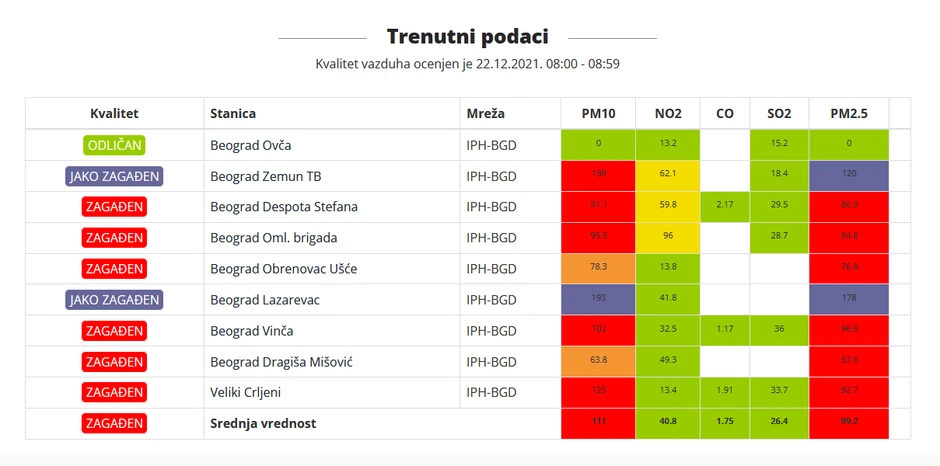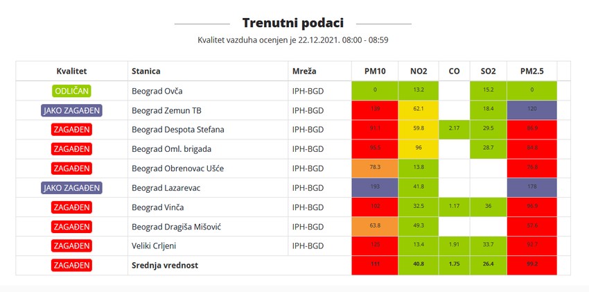 Prema sajtu Beoeko jako zagađen vazduh udišu stanovnici naselja Zemun, Lazarevac i Veliki Crljeni.