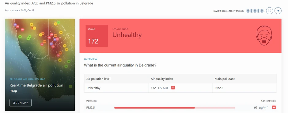 Kako stoji na pomenutoj aplikaciji, kvalitet vazduh u našem glavnom obojen je ovog jutra crvenom bojom, a koja označava da je isti nezdrav, dok indeks zagađenosti iznosi 172.