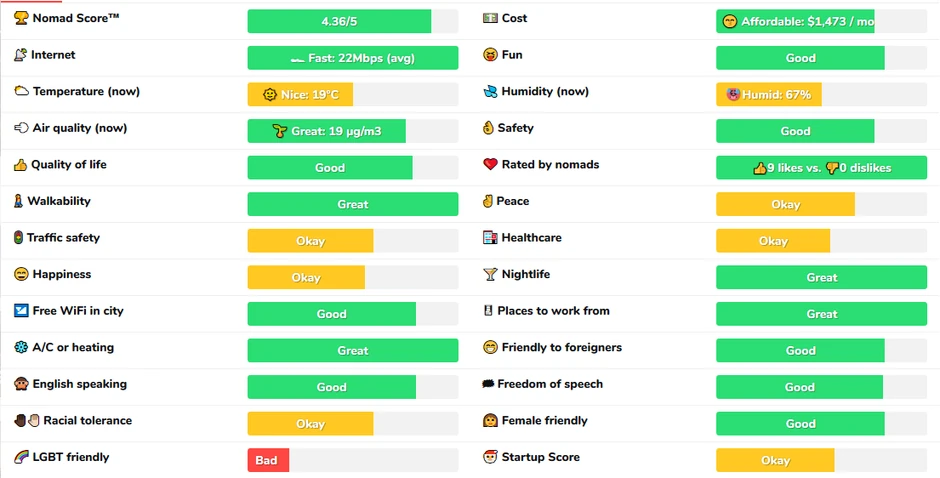 U kategoriji "za" i "protiv" je slična situacija. Pozitivno su ocenjene brzina interneta, bezbednost, kvalitet vazduha, obrazovanje, sloboda govora i mogućnost konverzacije na engleskom jeziku, kao i to što je grad bezbedan za žene.