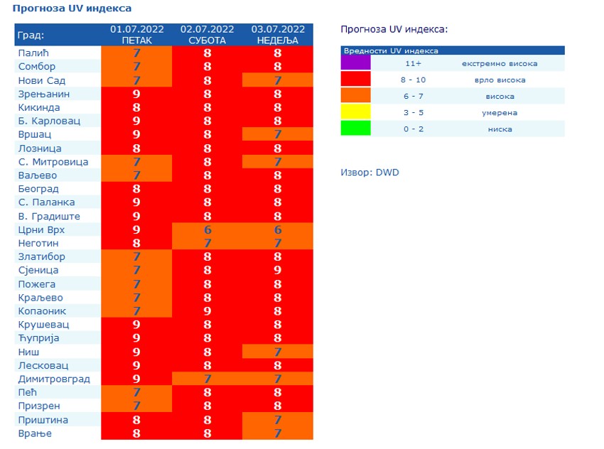 Pored visokih temperatura danas je veoma visoko i UV zračenje koje je izuzetno opasno, a kada se polgeda prognoza UV zračenja, koju objavljuje RHMZ, skoro cela Srbija je u crvenom. To je predzadnji stepen na tabeli UV indeksa (u većem delu Srbije je indeks 8 i 9, a sledeći ljubačisti nivo je od 11), što znači da će danas, ali i za vikend biti veoma opasno direktno se izlagati suncu.