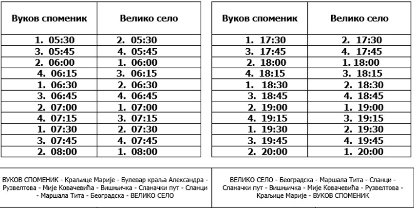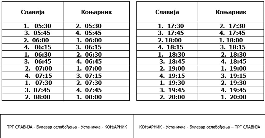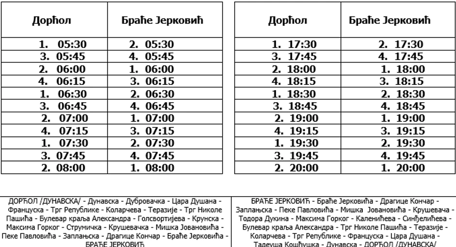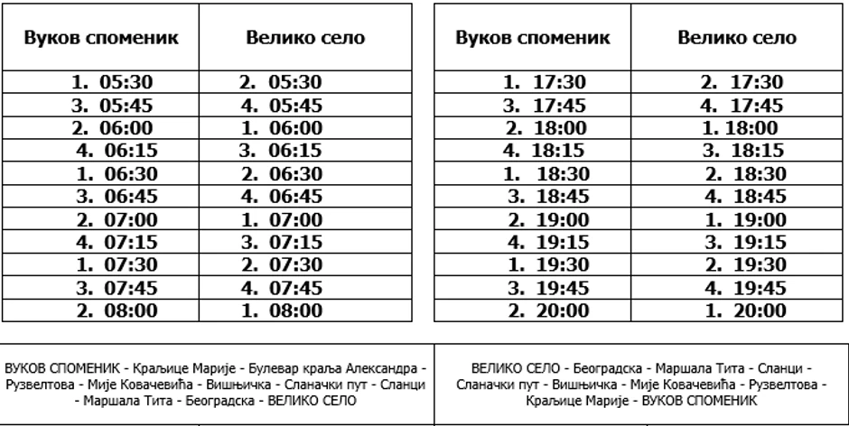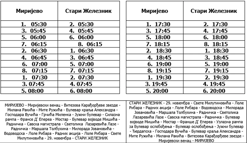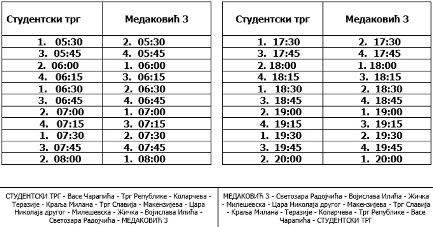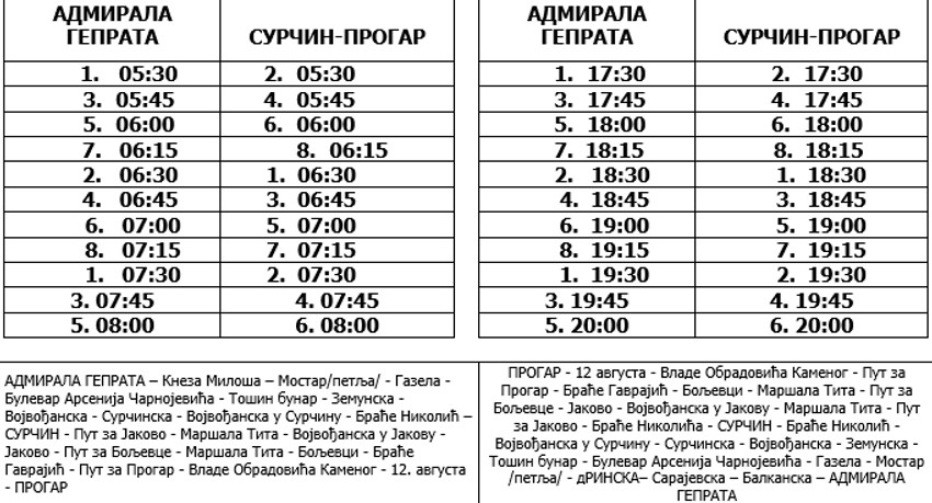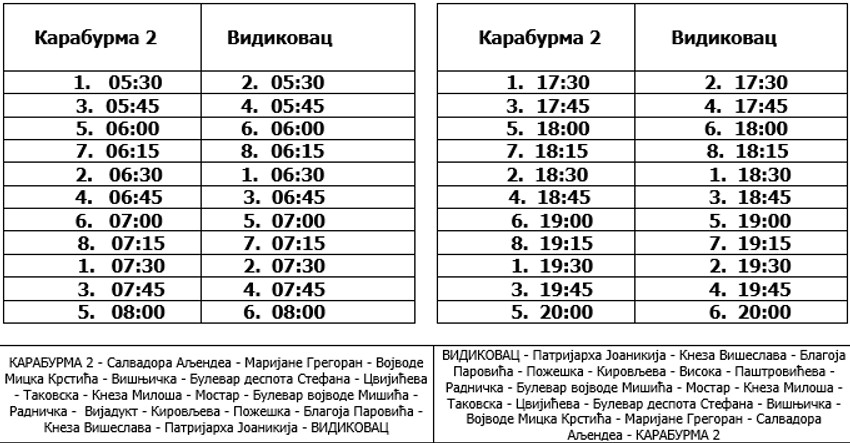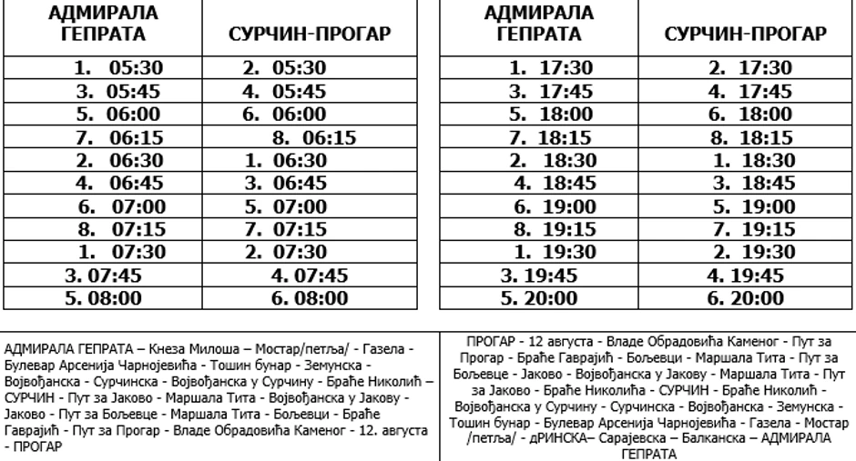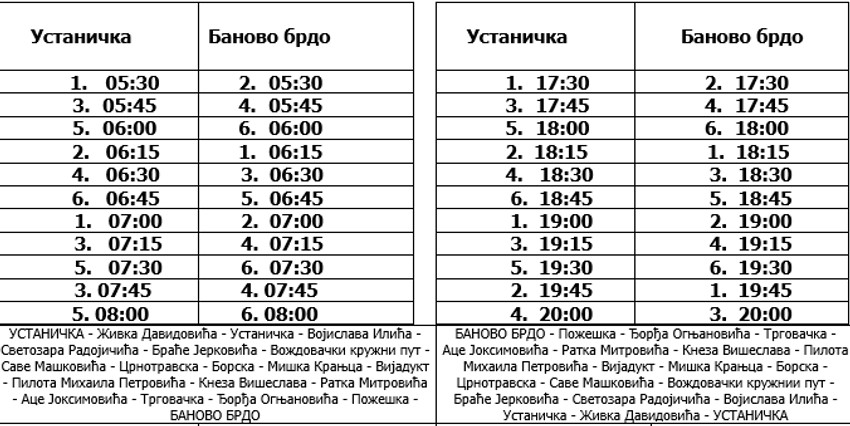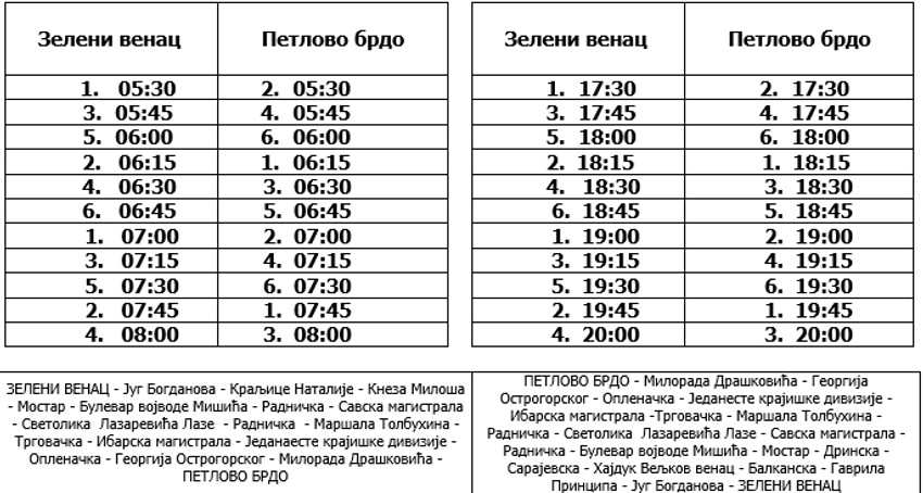 Dakle, prepodne će autobusi kretati na svim linijama u 5.30, 5.45, 6.00, 6.15, 6.30, 6.45, 7.00, 7.15, 7.30, 7.45, 8.00, i to iz oba pravca. Popodne sa polaznih stanica polaziće u 17.30, 17.45, 18.00, 18.15, 18.30, 18.45, 19.00, 19.15, 19.30, 19.45, 20.00.