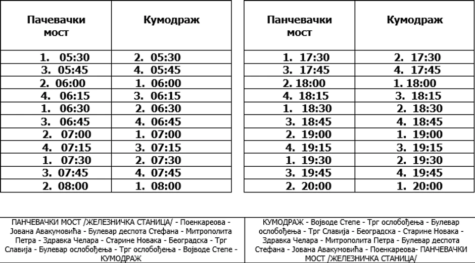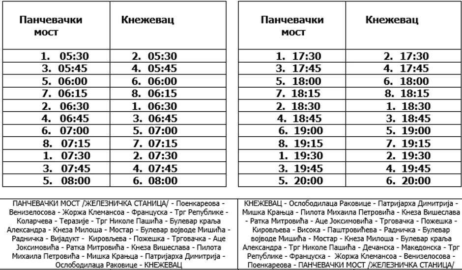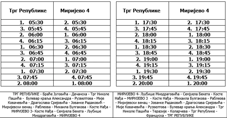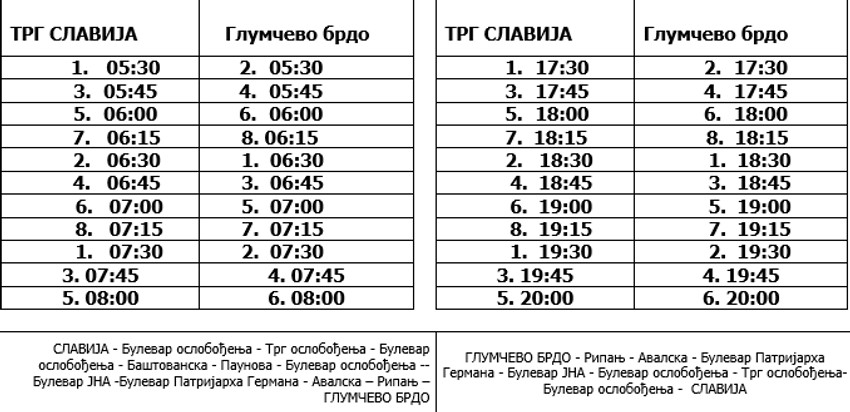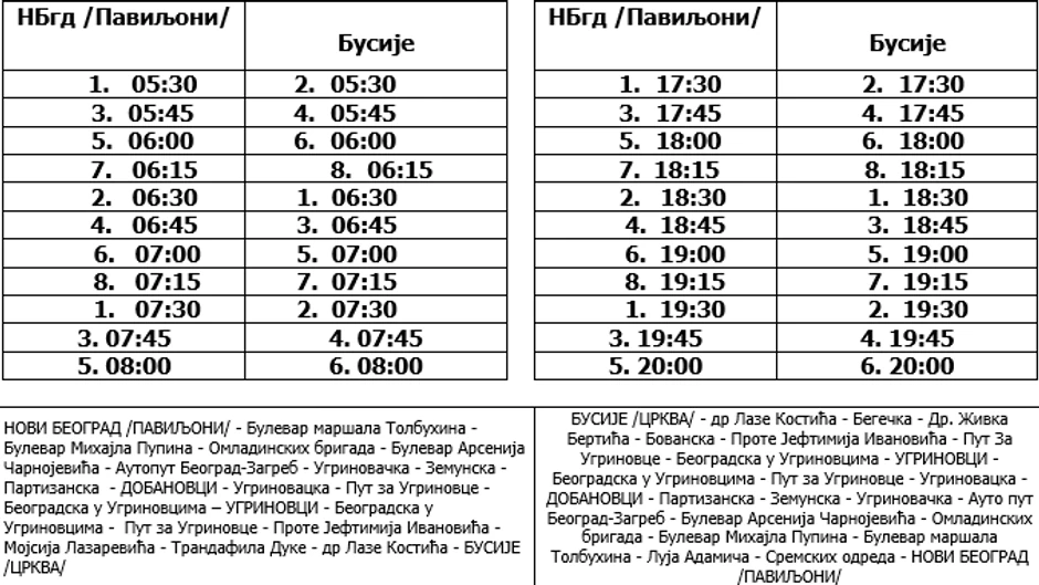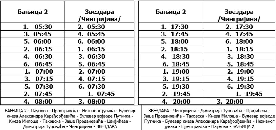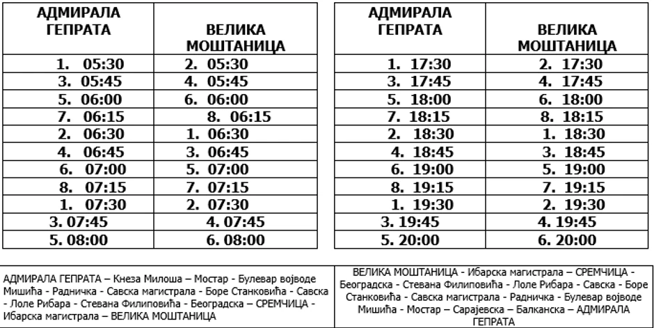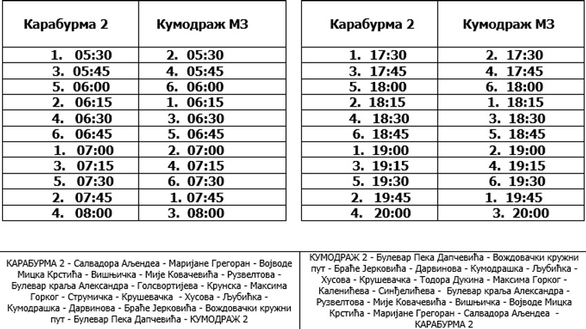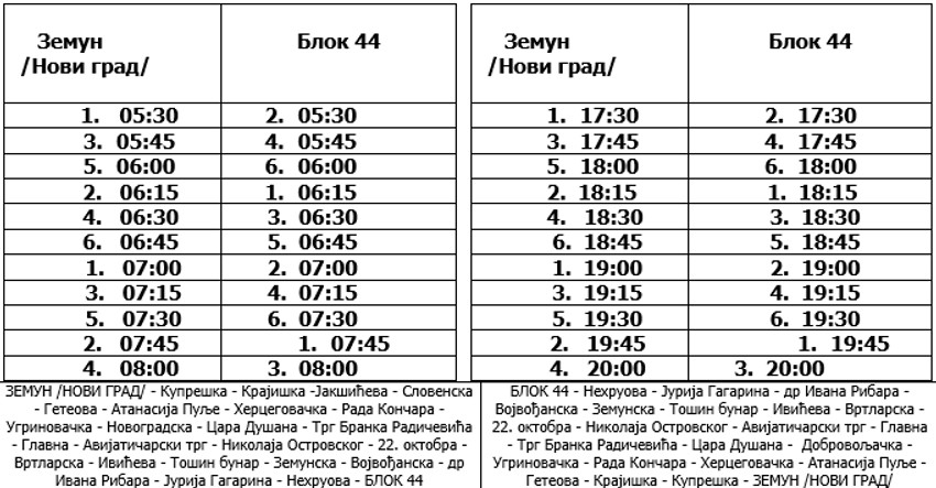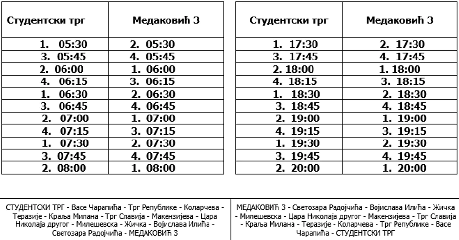 Dakle, prepodne će autobusi kretati na svim linijama u 5.30, 5.45, 6.00, 6.15, 6.30, 6.45, 7.00, 7.15, 7.30, 7.45, 8.00, i to iz oba pravca. Popodne sa polaznih stanica polaziće u 17.30, 17.45, 18.00, 18.15, 18.30, 18.45, 19.00, 19.15, 19.30, 19.45, 20.00.