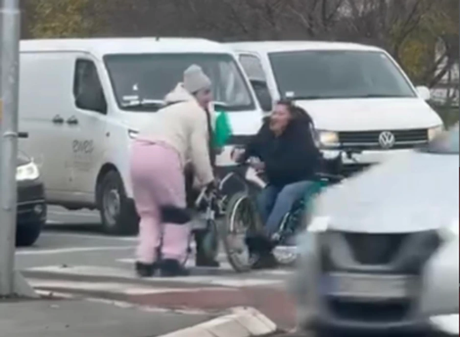 Jedna žena sedela je u invalidskim kolicima i vukla invalidska kolica druge žene koja je stajala sve vreme. Tu je bila prisutna i treća žena koja je u pokušaju da bude medijator, stišavala tenzije, ali bezuspešno.