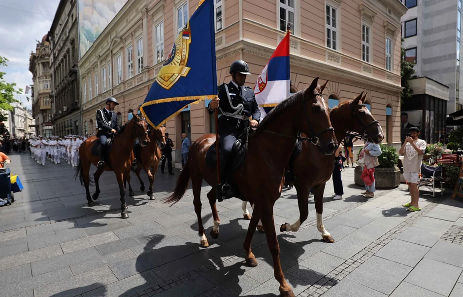 Uz zvuke marševa, naši konjanici, ali i pripadnici policije opšte nadležnosti, saobraćajne policije, Žandarmerije i vatrogasci pozdravili su građane.