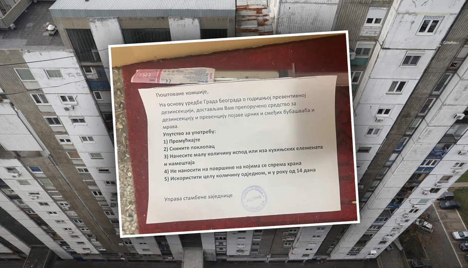 "Poštovane komšije, na osnovu uredbe Grada Beograda o godišnjoj preventivnoj dezinsekcije, dostavljam Vam preporučeno sredstvo za dezinsekciju i prevenciju pojave crnih i smeđih bubašvaba i mrava".