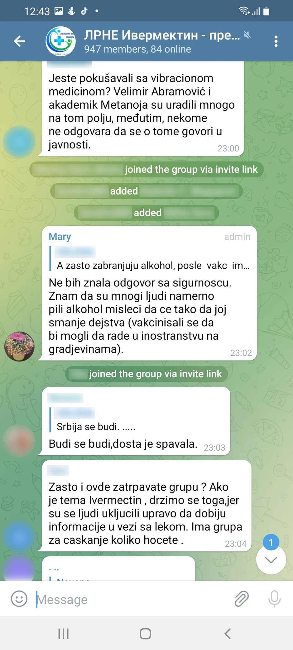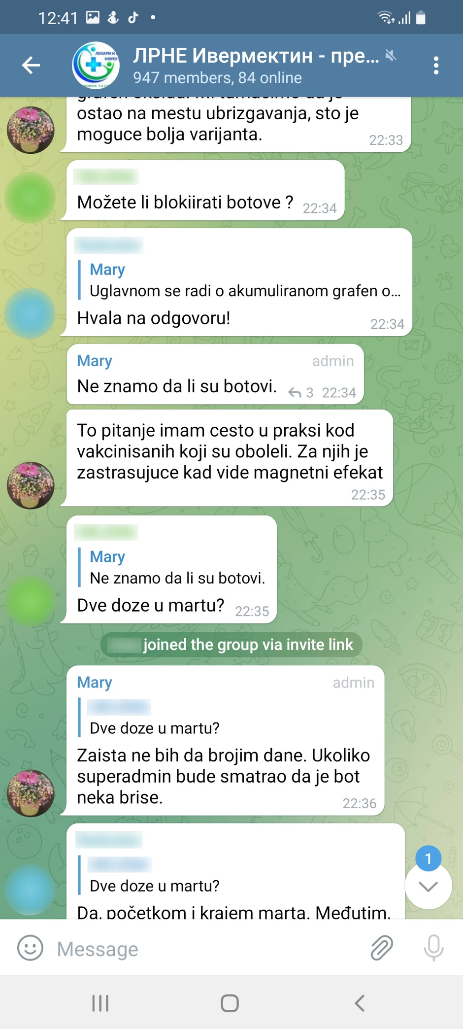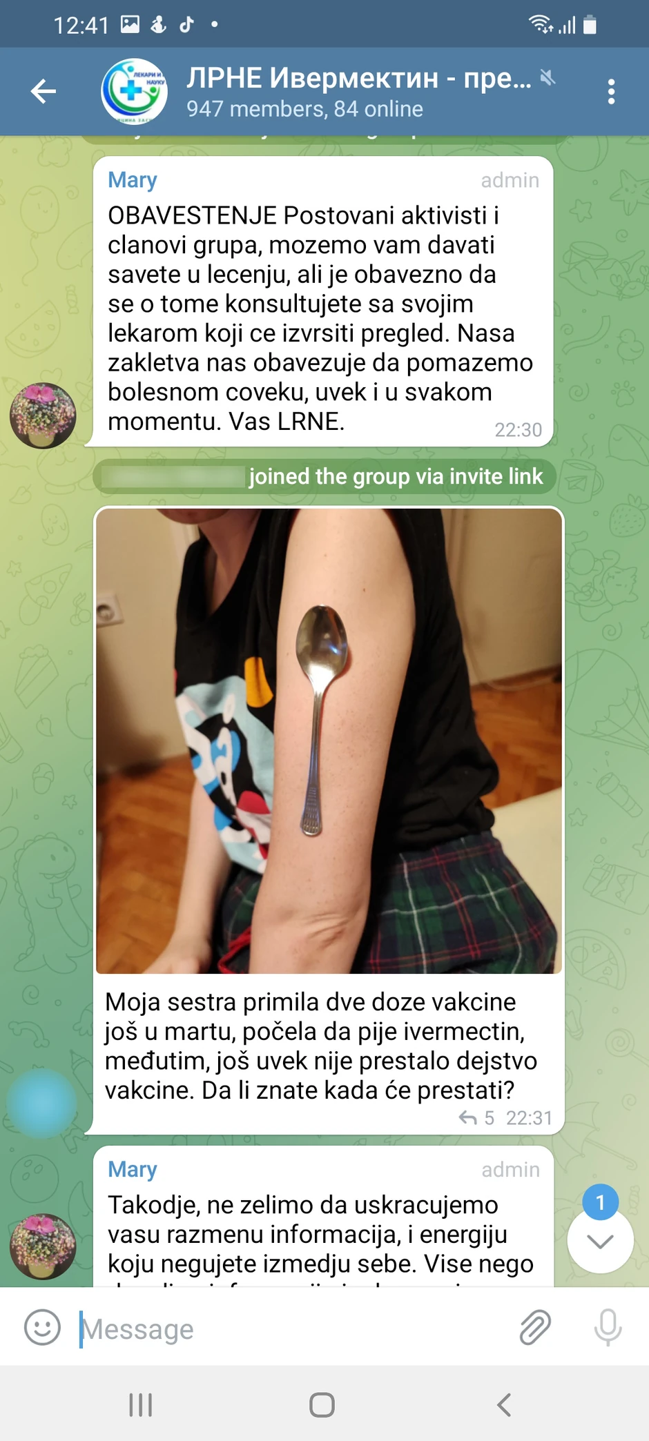 Dok se 18 lekara koji su savetovali i promovisali neregistrovani lek protiv kovida nalazi pred sudom časti Lekarske komore Srbije, deo aktivnosti sa vajber grupe posvećene ivermektinu nastavljen je na društvenoj mreži Telegram. U moru neproverenih i opasnih saveta, pre dva dana pojavio se još jedan "biser" među lekarima - prim. dr Marianne Vidojević, koja je u noći svog "dežurstva" na pomenutoj grupi, uporno se ograđujući od lečenja putem interneta, kako ju je savetovao advokat, između ostalog komentarisala i čuvenu "namagnetisanu kašiku" zalepljenu na ruku osobe vakcinisane kovidom 19.