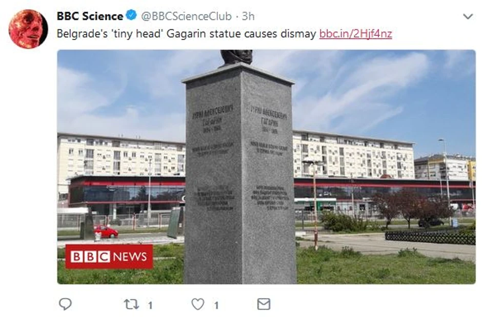 Pod naslovom "Beogradska "sitnoglava" statua Gagarina izazvala zaprepašćenje" britanski BBC objavio je tekst o spomeniku ovom slavnom kosmonautu, nedavno postavljenom na Novom Beogradu.