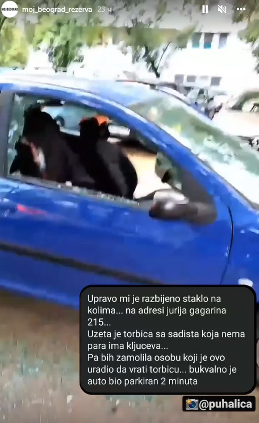 - Upravo mi je razbijeno staklo na kolima, na adresi Jurija Gagarina 215. Uzeta je torbica sa sedišta koje nema para, ima ključeva, pa bih zamolila osobu koja je ovo uradila da vrati torbicu. Bukvalno je auto bio parkiran dva minuta - navodi se u objavi.