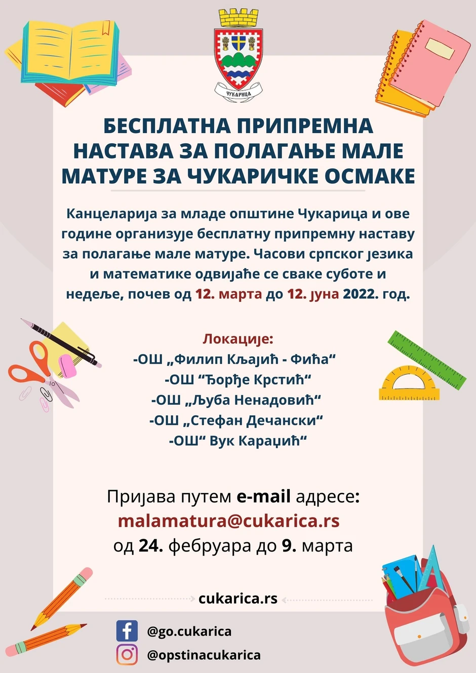 Sa željom da se čukarički osmaci što bolje pripreme za polaganje prijemnog ispita, Kancelarija za mlade opštine Čukarica i ove godine organizuje besplatnu pripremnu nastavu za polaganje male mature.