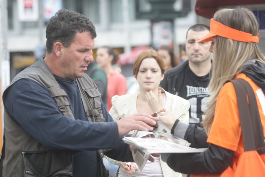Nasmejane promoterke su u okviru akcije "Brend tu hend", imale pune ruke posla, jer su građani užurbano prilazili i tražili svoj primerak novina i kafe.