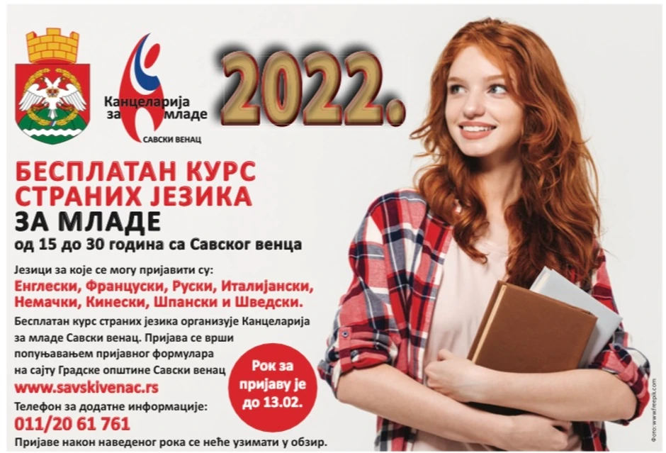 Opština Savski venac i Kancelarija za mlade GO Savski venac obaveštava sve koji imaju od 15 do 30 godina, a koji žive na teritoriji opštine da ponovo počinju besplatni kursevi stranih jezika.