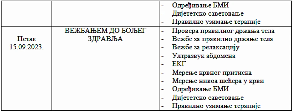 Značaj vežbanja za zdravlje ljudi posebno će biti naglašen u petak, 15. septembra, kada će zainteresovani moći da saznaju sve o pravilnom držanju tela, da se informišu o vežbama, ali će i ovog dana biti dostupni primarni pregledi.