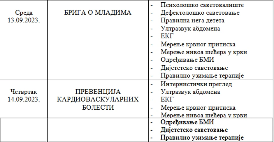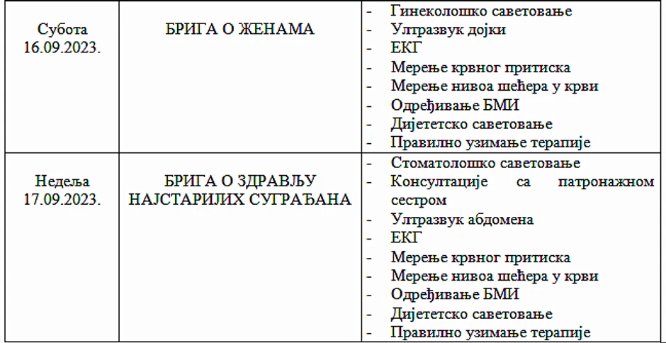 Briga o ženama i njihovom zdravlju, kao i o najstarijim sugrađanima rezervisana je za subotu i nedelju. U subotu će žene moći da obave ginekološko savetovanje i urade ultrazvuk dojki, dok će u nedelju najstarijim sugrađanima biti omogućeno stomatološko savetovanje, kao i konsultacije sa patronažnom sestrom.