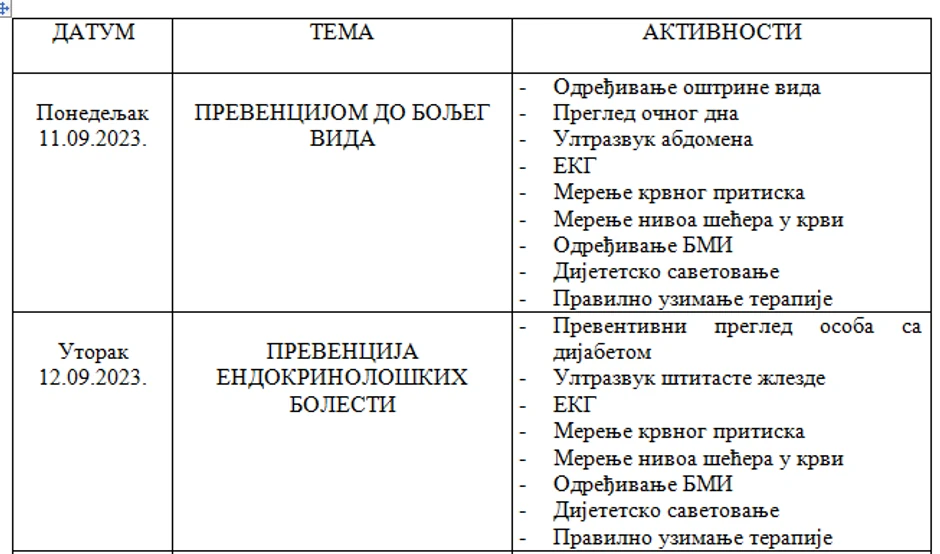Prvog dana, 11. septembra, biće organizovani pregledi „Prevencijom do boljeg vida”, gde će se, između ostalog, kontrolisati oštrina vida, ali i obaviti pregled očnog dna i merenje krvnog pritiska. Građani će dobiti i savete o pravilnom uzimanju terapije.