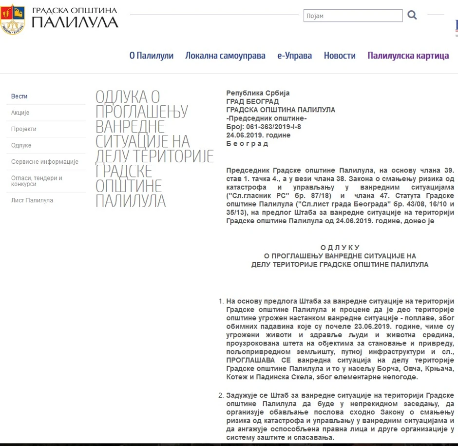 Predsednik GO Palilula doneo je odluku o proglašenju vanredne situacije na delu teritorije te opštine, na predlog Štaba za vanredne situacije, piše u saopštenju na zvaničnom sajtu GO Palilula.