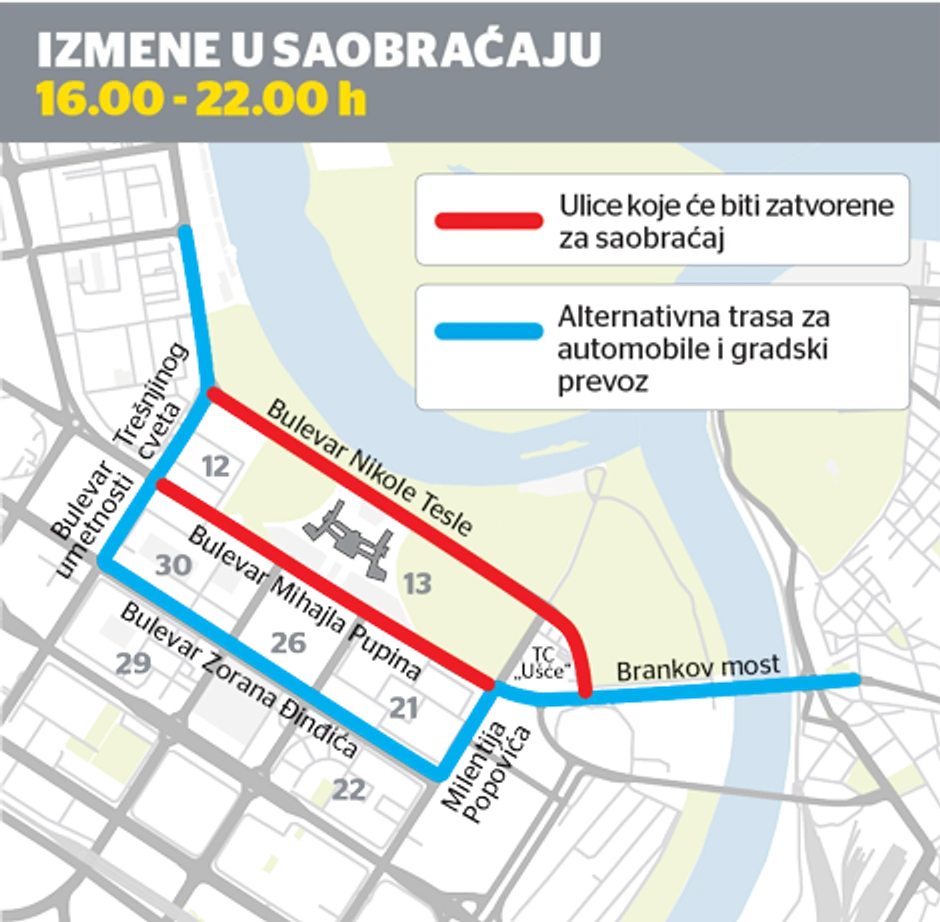 Tokom tih šest sati za saobraćaj će biti zatvoren deo Bulevara Nikole Tesle, od Brankovog mosta do Ulice Trešnjin cvet, i to u oba smera. Takođe, vozila neće saobraćati ni u delu Bulevara Mihajla Pupina, od Ušća do Ulice Trešnjin cvet, takođe u oba smera. To znači da automobilima neće moći da se prolazi ni sa gornje, ni sa donje strane Palate Srbija.
