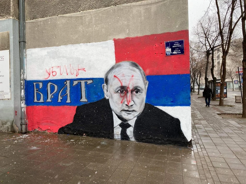 Nije prošao ni dan, a mural Putinu je išaran pošto je crvenom farbom precrtan lik predsednika Rusije dok je iznad poruke "brat" ispisano "ubica".
