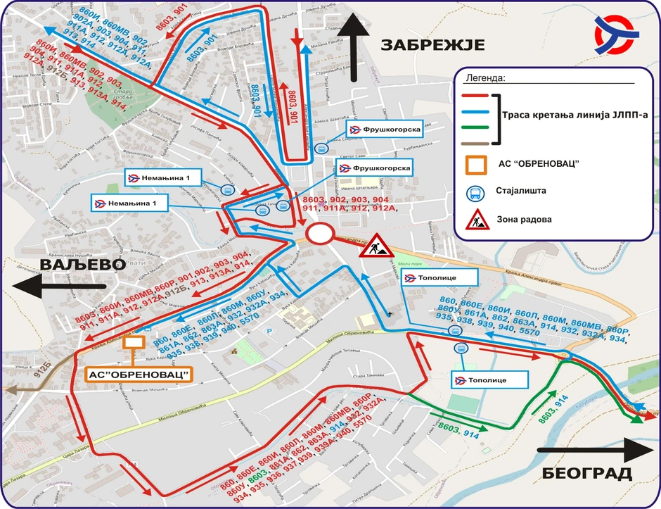 Linije 860, 860E, 860L, 860M, 861A, 862, 863A, 932, 932A, 934, 935, 939, 940, 5570 u smeru ka AS „Obrenovac” saobraćaće sledećom trasom: Obrenovački put – Miloša Obrenovića – Kralja Petra I – Vuka Karadžića – Kralja Aleksandra I – AS „Obrenovac”. U smeru ka Beogradu: AS „Obrenovac” – Kralja Aleksandra I – Ljube Nenadovića – Belopoljska – Boška Buhe – Vašarište – Miloša Obrenovića – Obrenovački put i dalje redovnim trasama.
